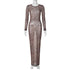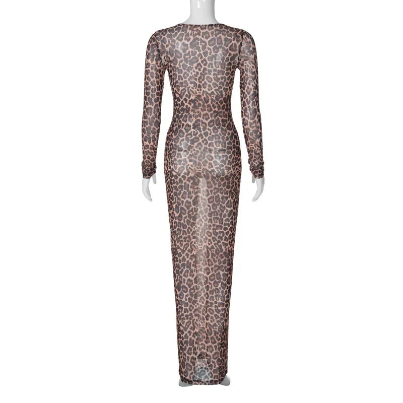 Leopard Print Mesh See Through Sexy Party Club Maxi Dress Outfits Women Autumn Winter Long Sleeve Y2K Streetwear Dress Vestido