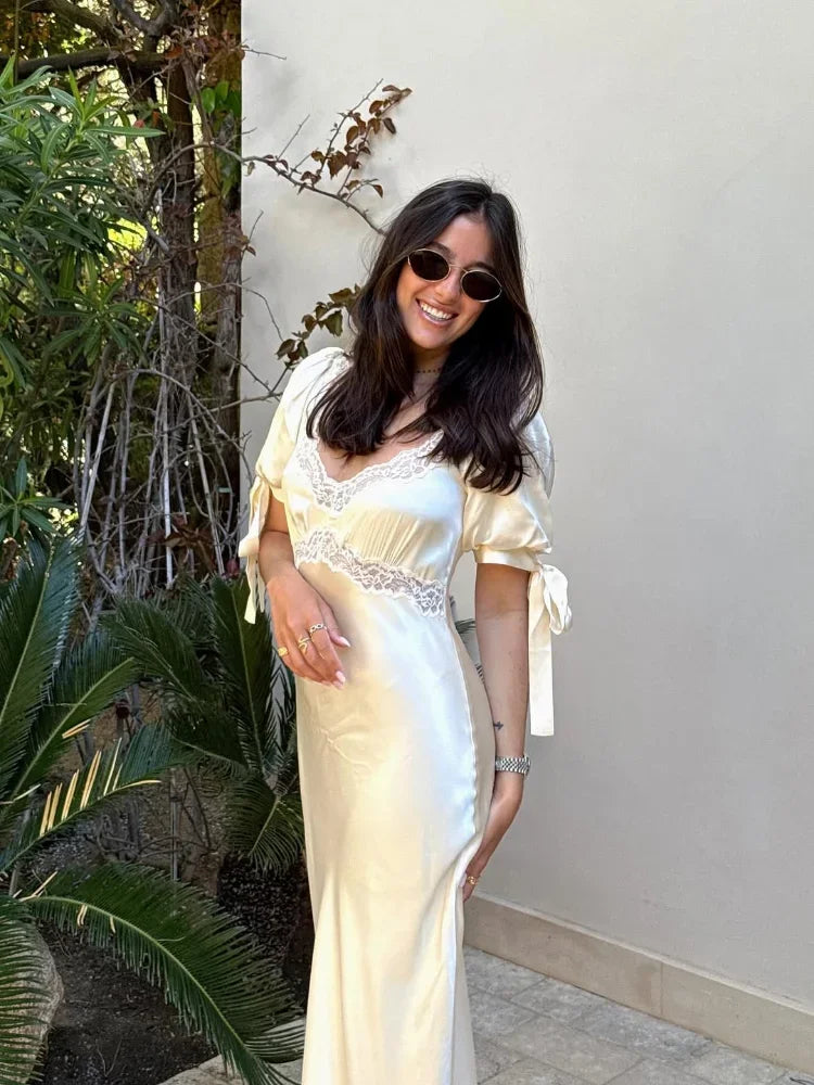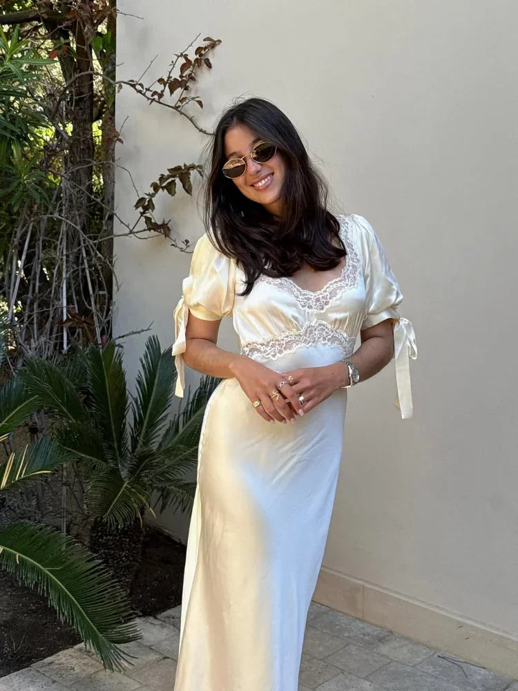 Women Lace Patchwork Satin Maxi Dress Elegant Bow U-neck Short Sleeve High Waist Slim Dresses 2025 New Summer Lady Commute Robes