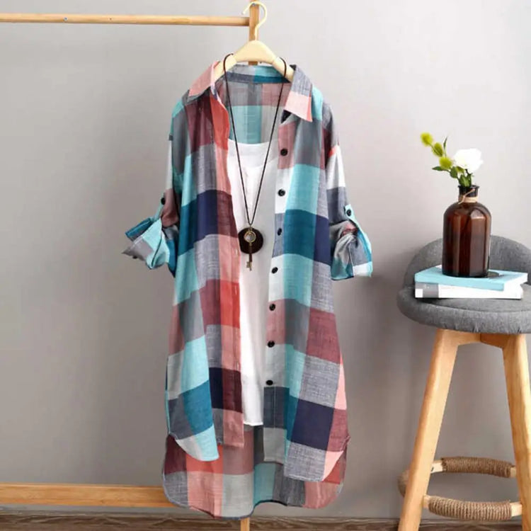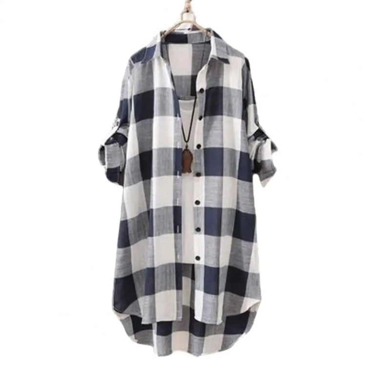 Women's shirts with long sleeves, pull-up sleeves, lapels, mid-length, check print, simple appearance are very popular among women.