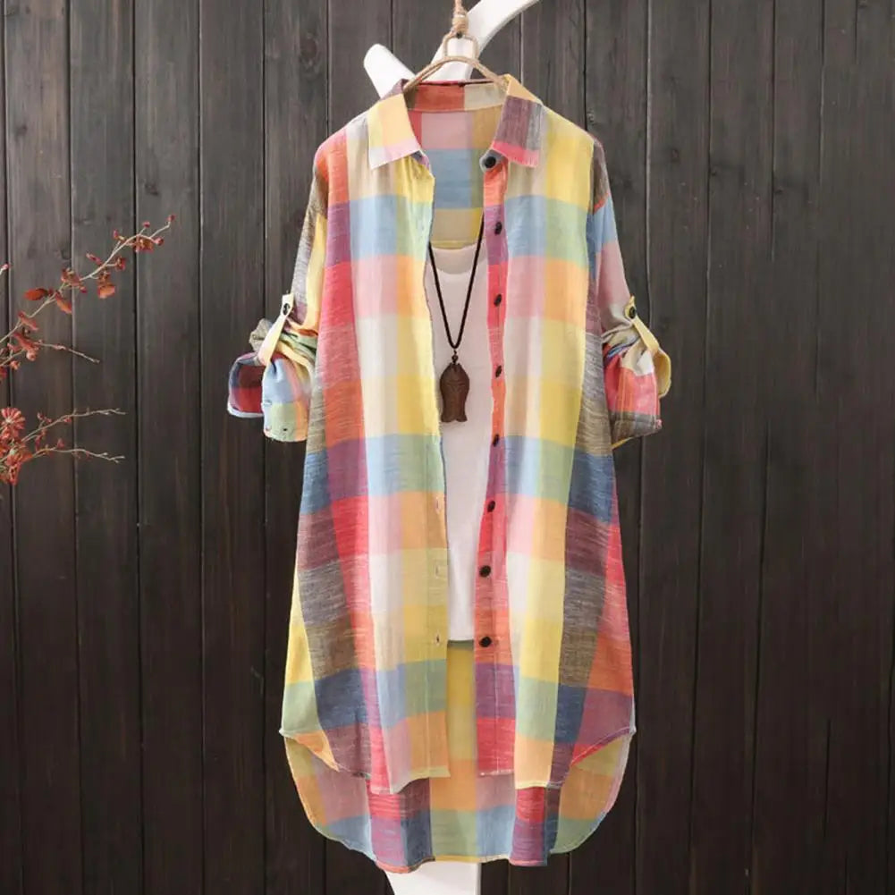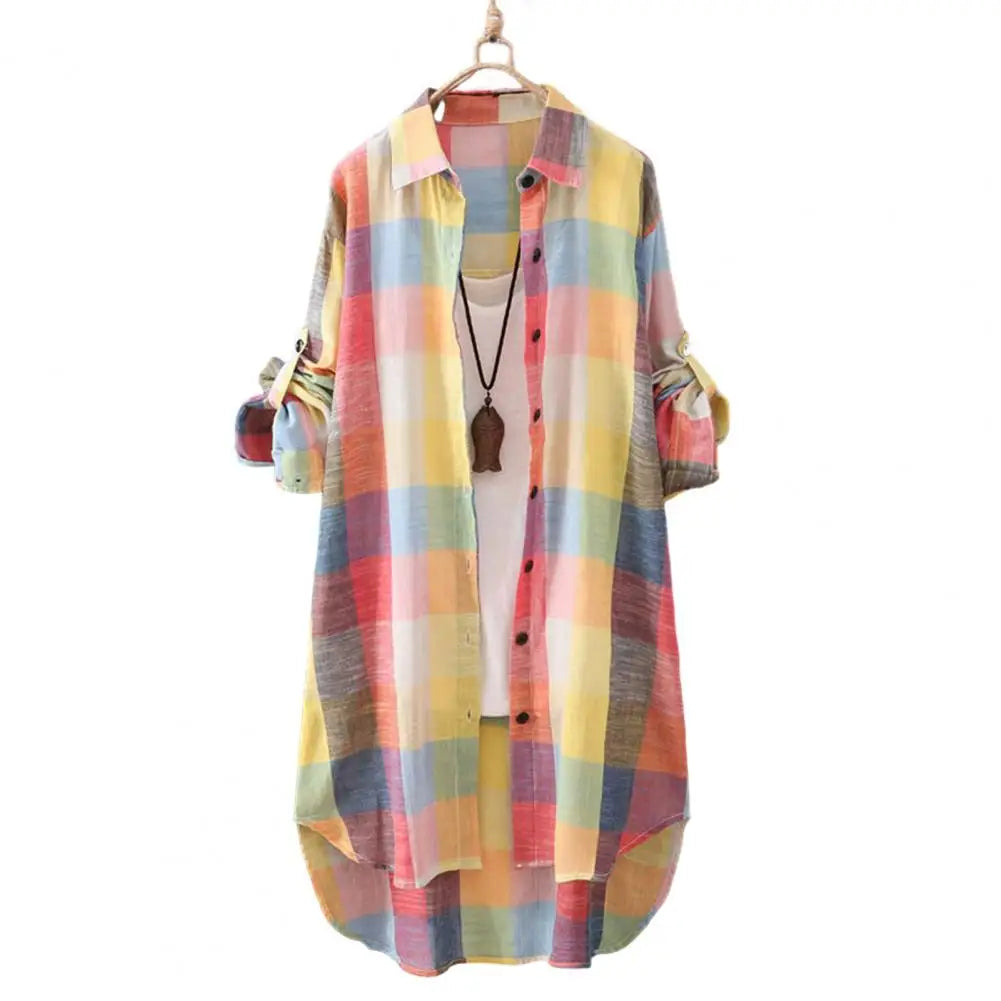 Women Shirt Plaid Print Contrast Color Irregular Hem Single-breasted Long Sleeve Lapel Oversized Soft Breathable Lady Long Top