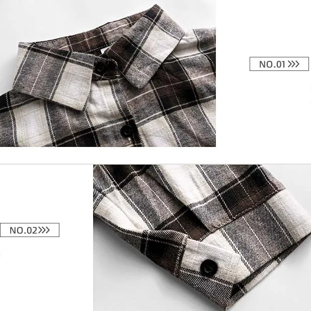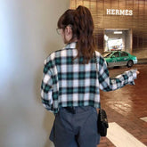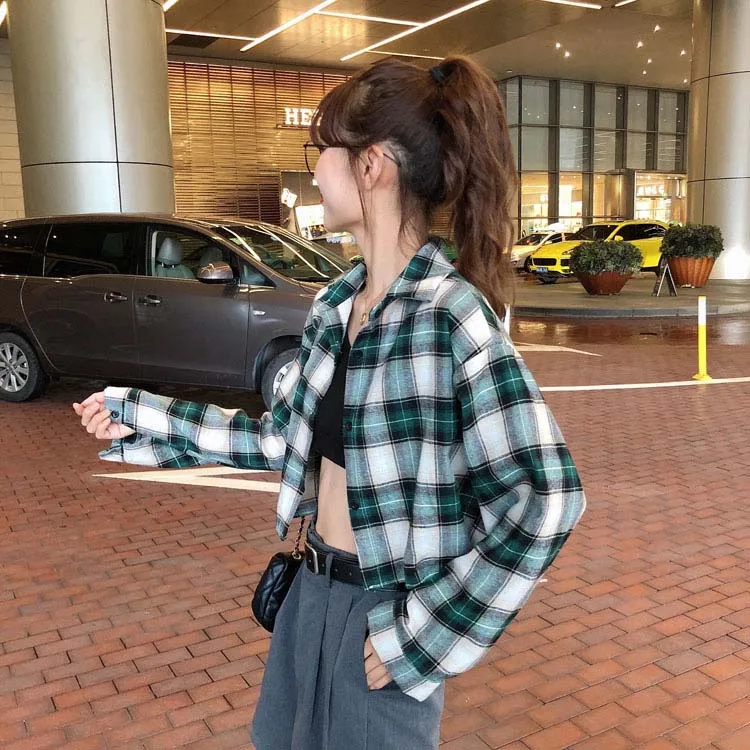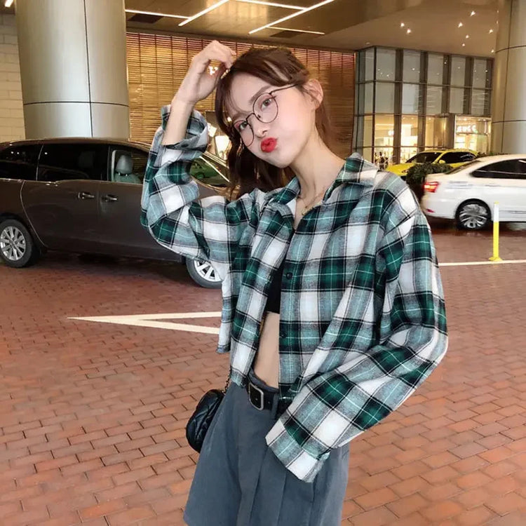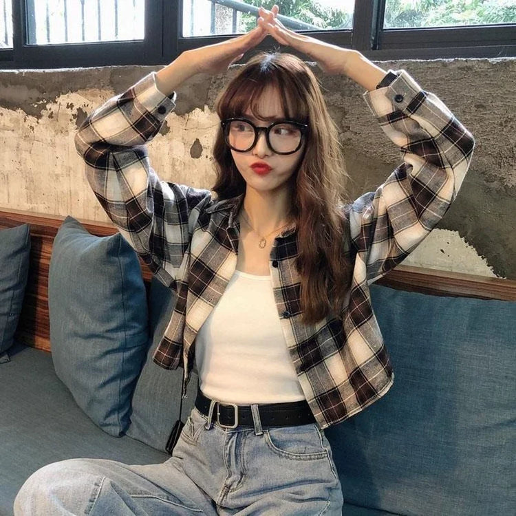 Women Cropped Shirts Plaid Preppy Style Loose Turn Down Collar Top Spring Korean Fashion Single Breasted Outwear Sunscreen Shirt