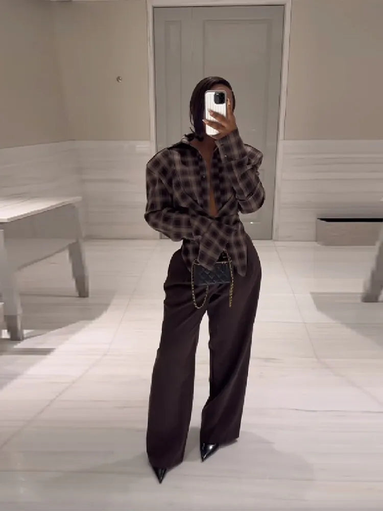 Deep V-neck Plaid Long Sleeve Shirt Asymmetrical Glamorous Hollow Out Irregular Hem Loose Fitting Tops Charming Women Partywear