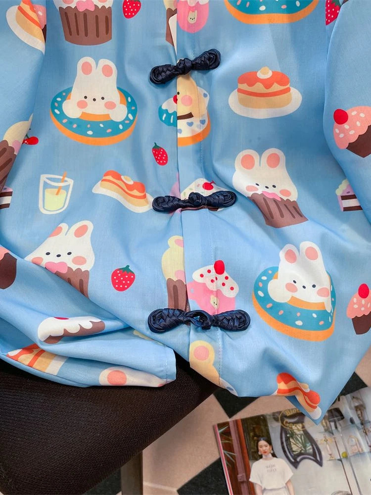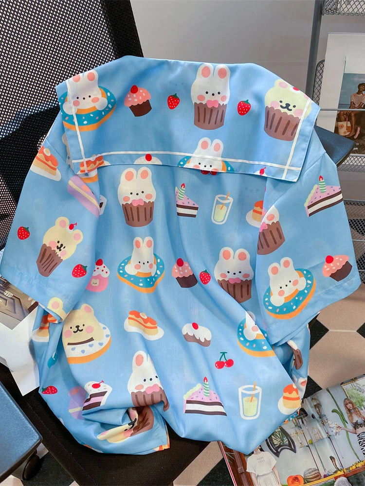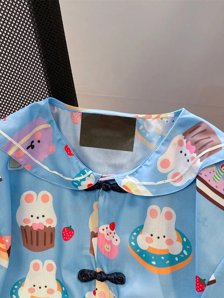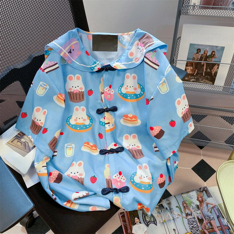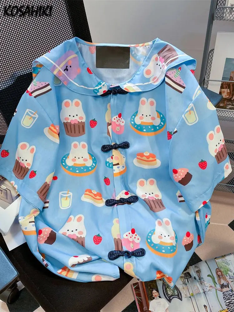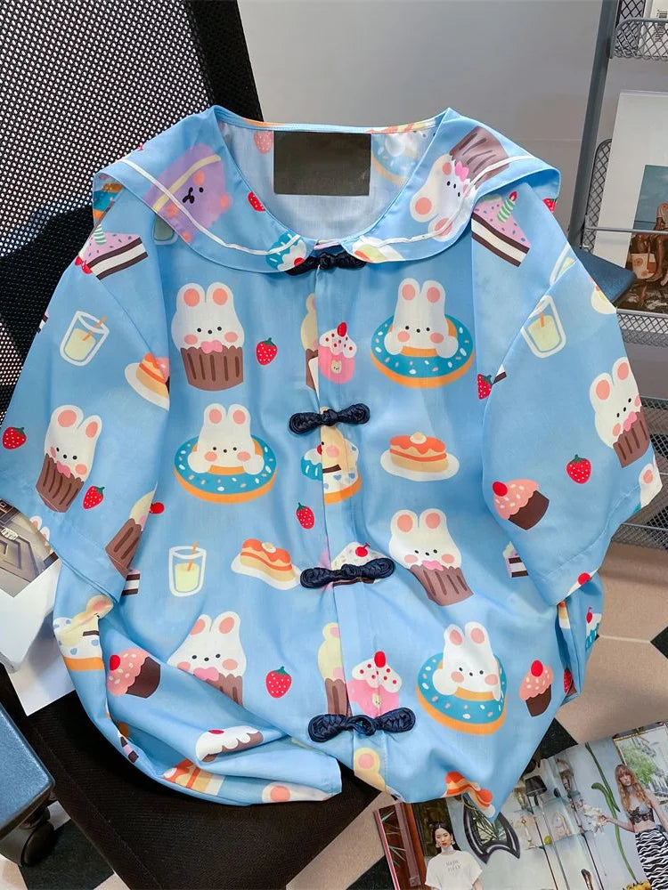 Japanese Sweet Short Sleeve Women Blouse Sailor Collar Casual Loose Rabbit Print All Match Grunge Shirt Fashion Harajuku Blusas