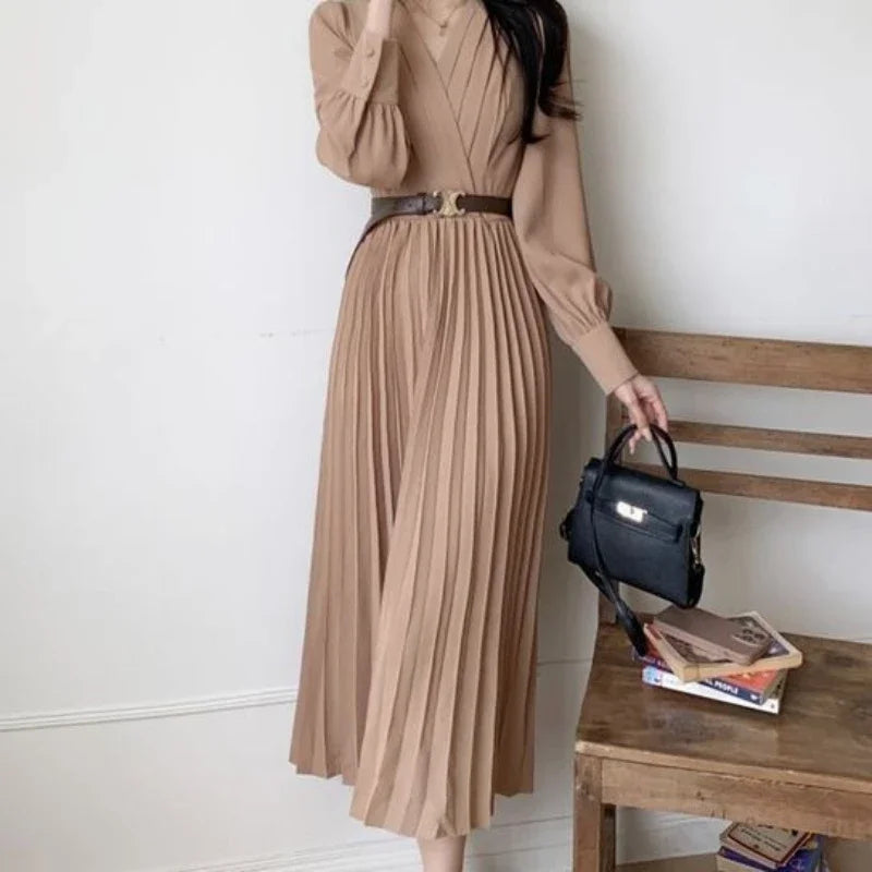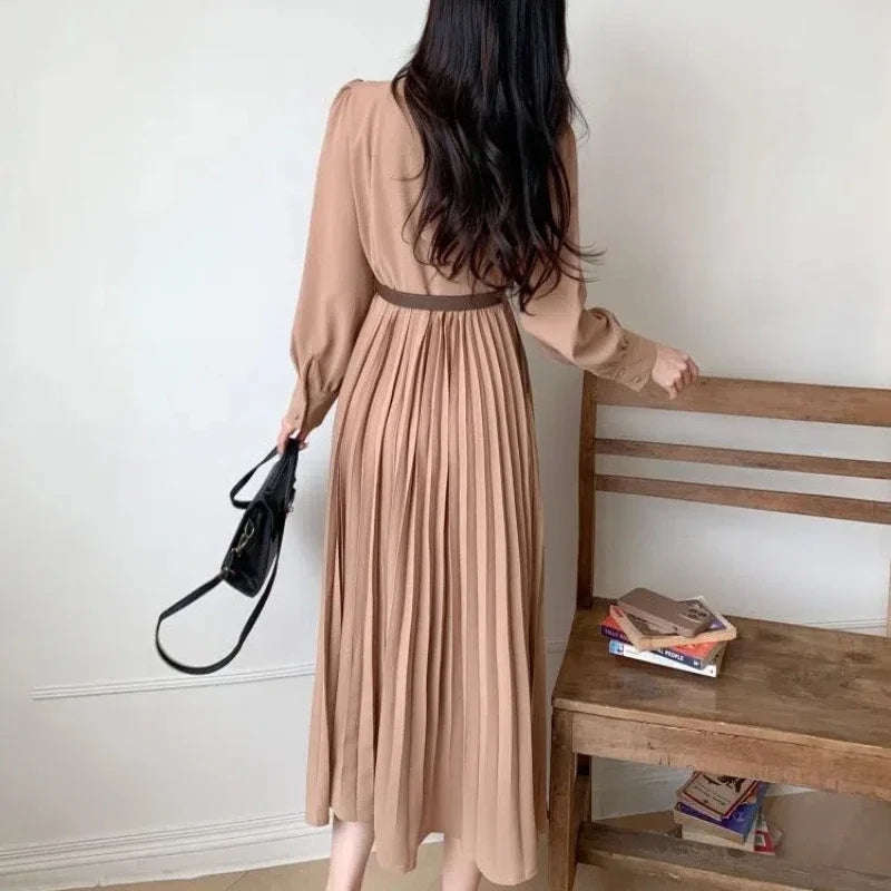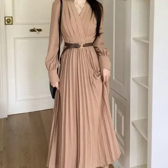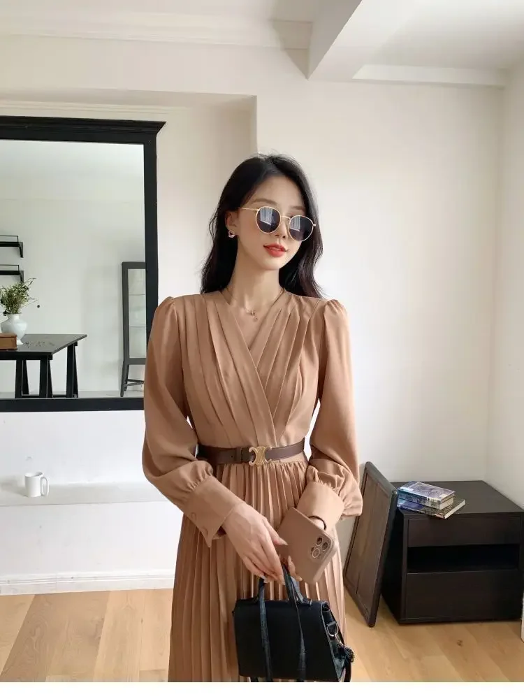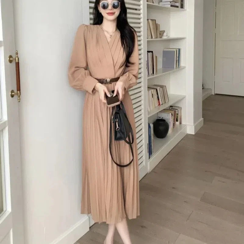 Korean Solid V-Neck Long Sleeve Shirt Dress Women Autumn New Fashion Vacation Waist Hundred Folds Sashes Office Lady Midi Dress
