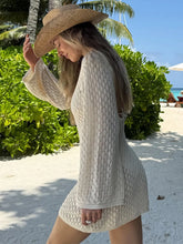 Beach Party Knit Dress For Women Summer Fashion Hollow Long Sleeve Short Dresses Solid V Neck Knitwear Crochet Cover Up Dress