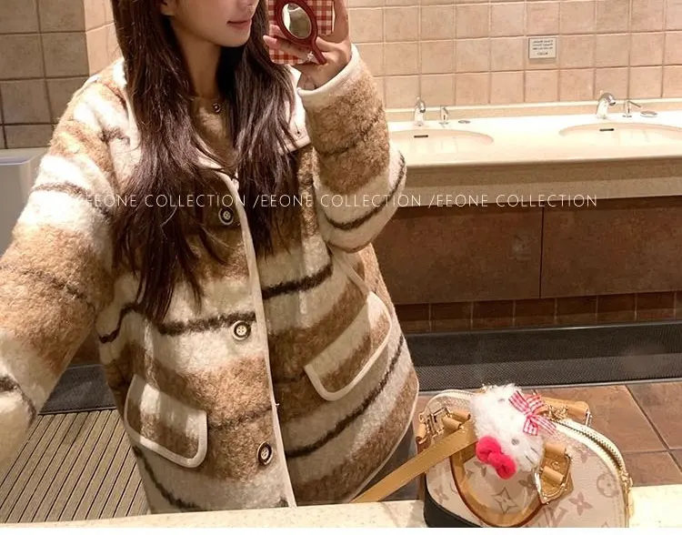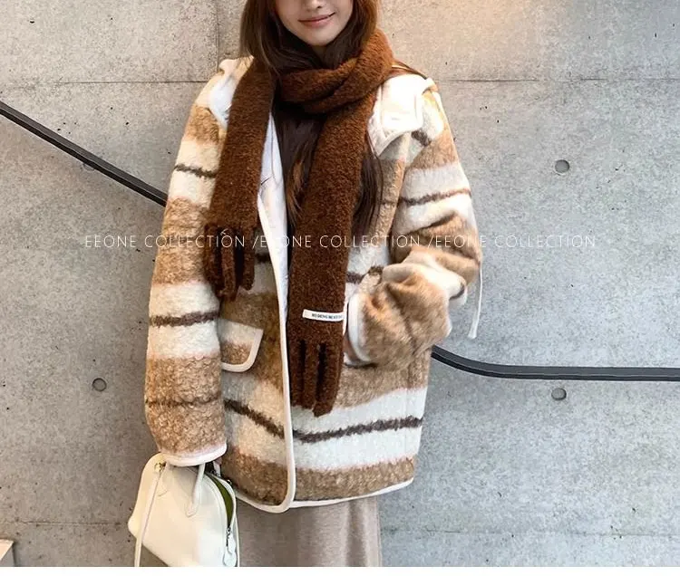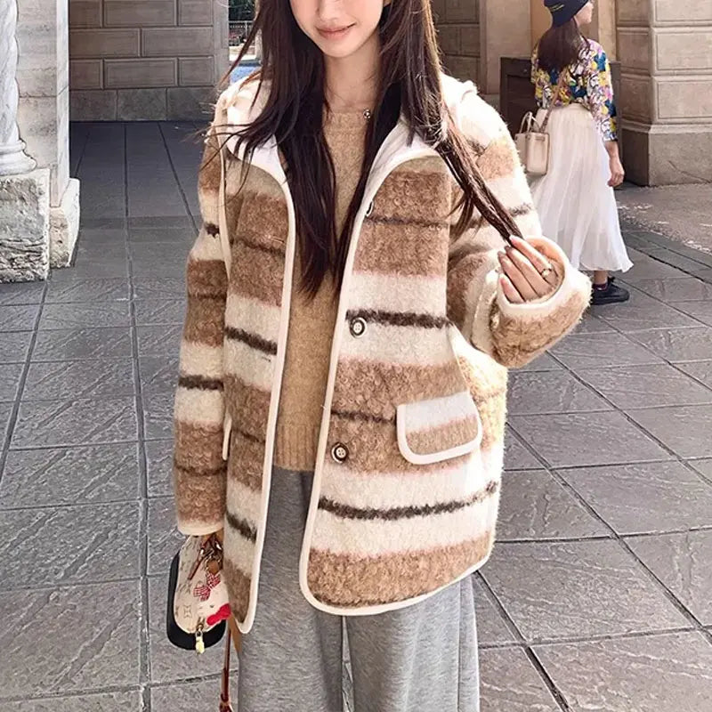 Casual Vintage Hooded Striped Wool Coats Autumn Winter New Loose Pockets Spliced Female Clothing Stylish Single-breasted Blends
