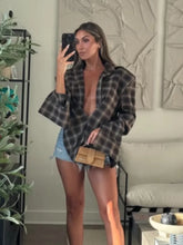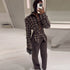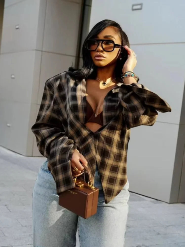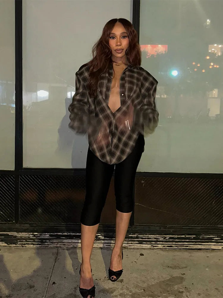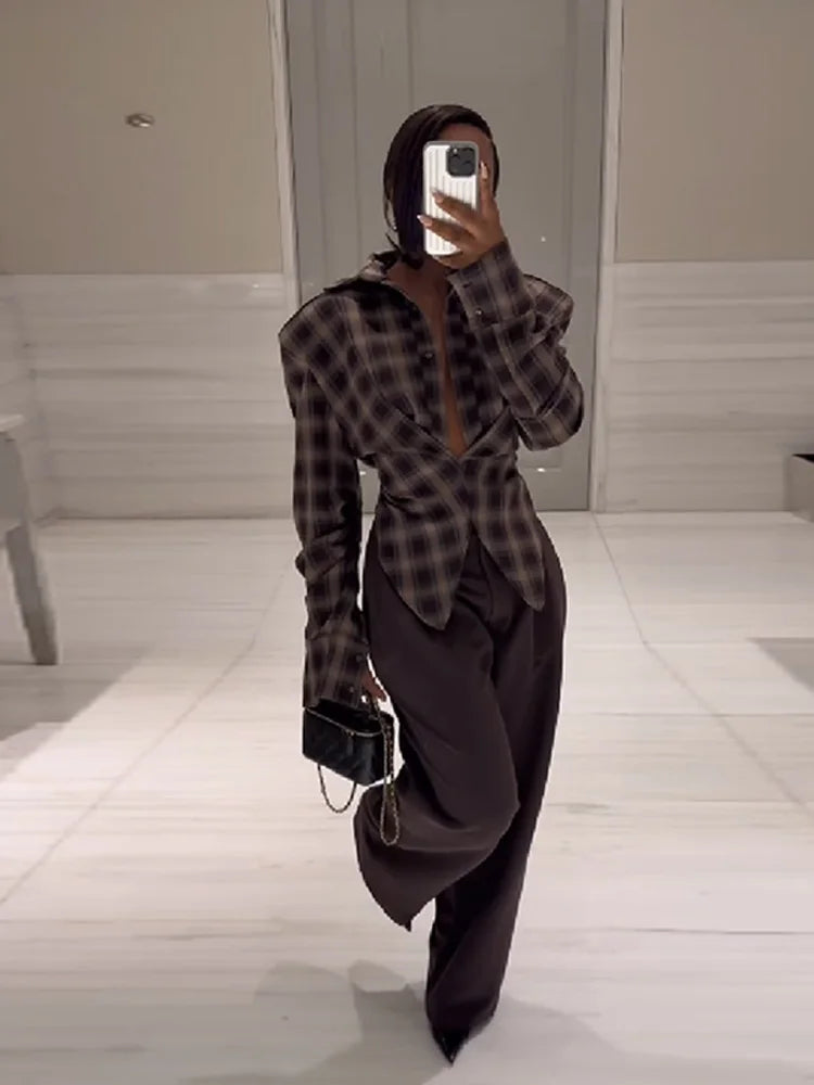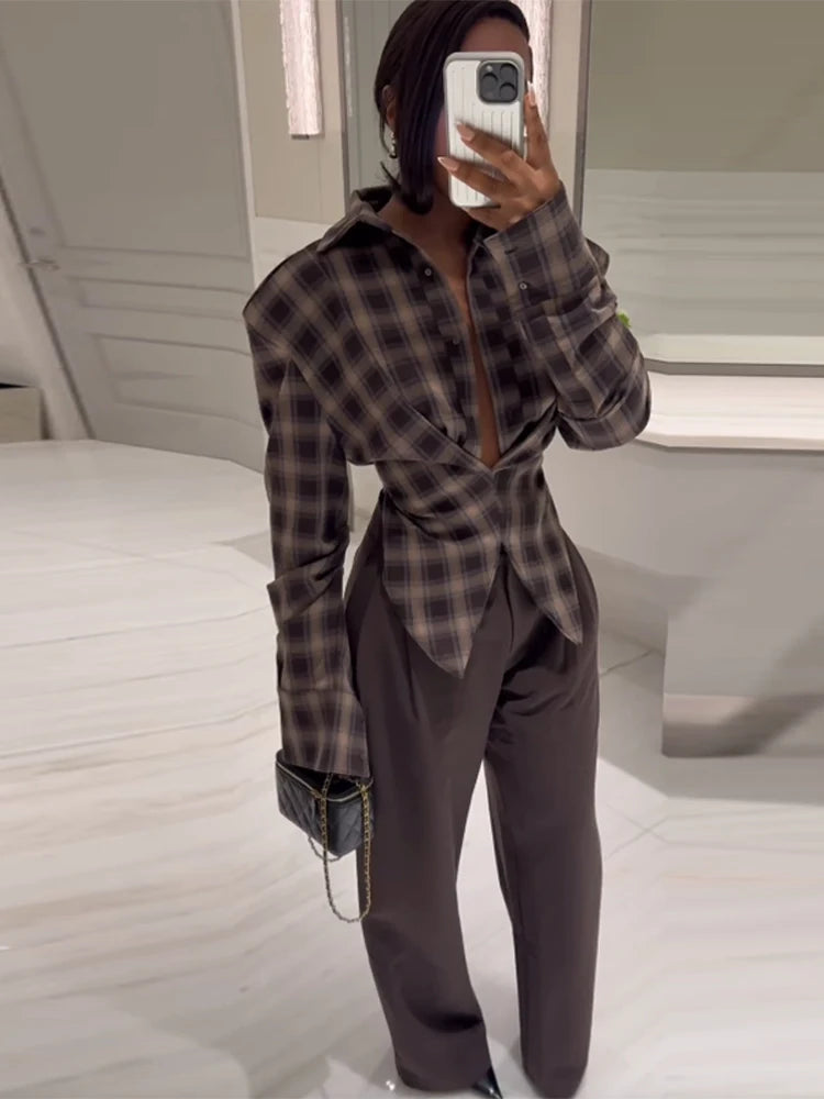 Deep V-neck Plaid Long Sleeve Shirt Asymmetrical Glamorous Hollow Out Irregular Hem Loose Fitting Tops Charming Women Partywear