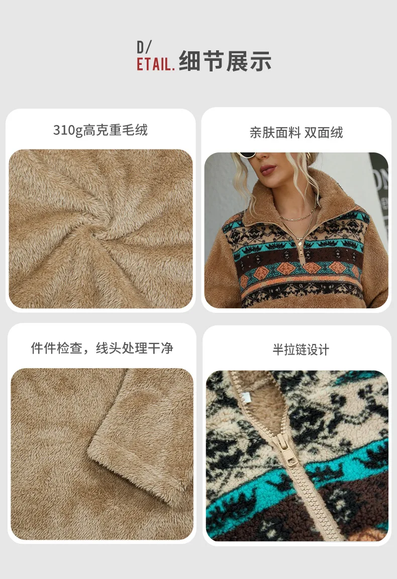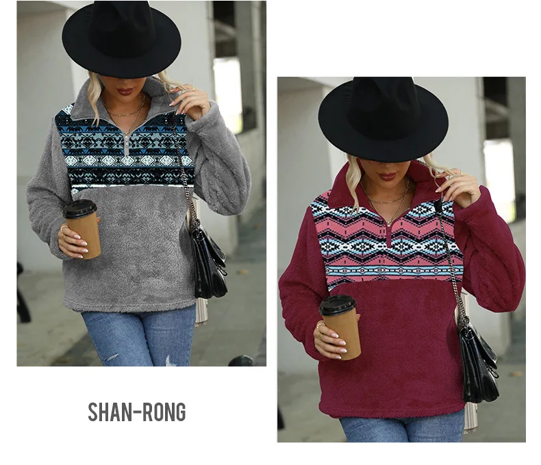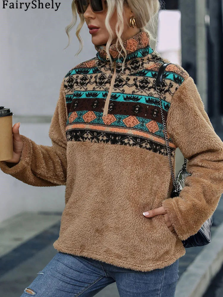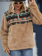 Fairyshely 2025 Winter Print Women Hoodies Casual Long Sleeve Hood Sweatshirt Loose Autumn Lady Stand Collar Plush Hoodie Tops
