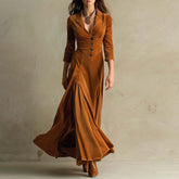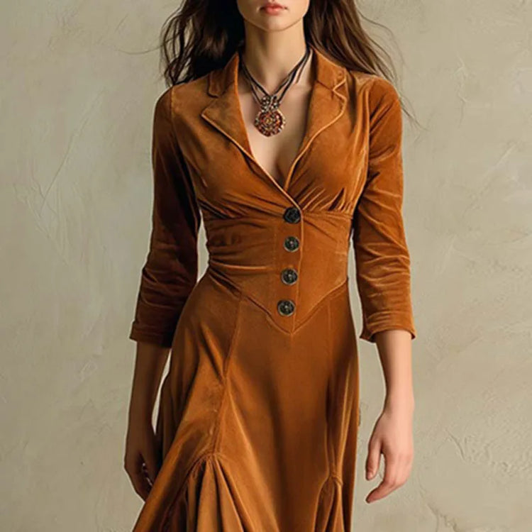 Fall Turn-down Collar Buttons Long Dress Woman Elegant Solid Slim Swing Pleated Dress Winter Long Sleeve Soft Velvet Party Dress