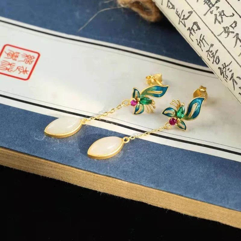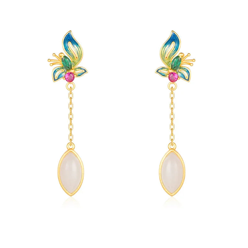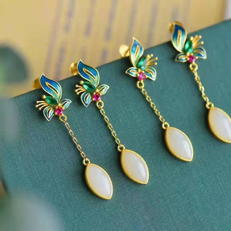 Natural Hetian White Jade Court Style Earrings for Women Original Butterfly Vintage Chinese Styles Earings High Fine Jewelry