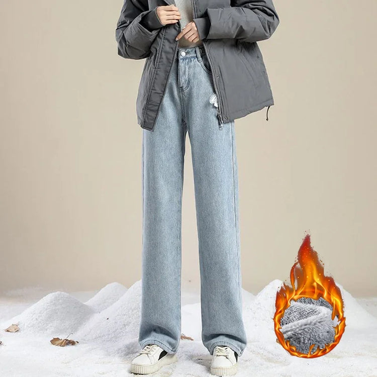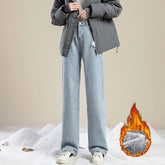 Winter Girls Plush Thermal High Waist Solid Jeans Lady Fleece Snow Warm Denim Pants Women Baggy Straight Leg Daily Trousers