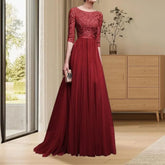 Women Prom Party Dress Round Neck Lace Flower Embroidery Half Sleeve Tight Waist Patchwork Floor Length Pleated Lady Fall Winter Maxi Evening Dress